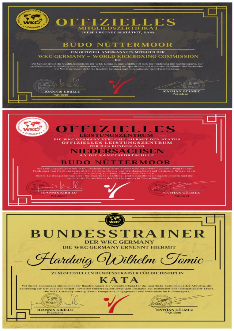 Budo Nüttermoor gehört der World Karate & Kickboxing Commission – WKC Germany an. Pässe und Jahressichtmarken können bei uns erworben werden. Die Pässe sind das offizielle Dokument in dem die Graduierung des Budokas, Wettkampferfolge, Seminarteilnahmen und Kampfrichterlizenzen festgehalten werden.